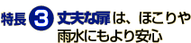 | 鴨居,敷居部分には,滑りや耐久性に優れたアルミの押し出し材を採用.扉の開閉も軽くて静か,汚れやすい敷居レールも扉を外して簡単に掃除ができます. | 鍵がなくても仮ロックできるイナバ独自のカマ錠採用.また,学校や団地などの公共用向けとして南京錠やナンバー錠が使用できるよう掛金(オプション)が用意されており,簡単に取り付けできます.(鍵は上下のないリバーシブルキー採用,仮ロックは内側から解錠することができます) | 扉の合わせ部分には段付加工が施されており,外部からのほこりや雨水,雪などが入りにくい構造となっております. 扉は乙種防火戸対応型(板厚0.8mm)のため丈夫でより安心です. |