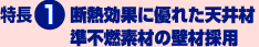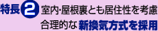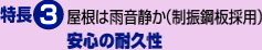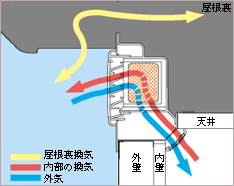 居住性を考えた新換気方式を採用.天井面に集まった汚れた空気は回り縁ガラリ,換気ガラリを通って効率よく外部へ.また,結露防止などのために屋根裏換気をよくする配慮が施してあります. | 雨音静かな屋根パネル 雷雨や台風時の気になる雨音が室内や外部に響きにくい制振鋼板製屋根パネル採用のため事務作業や勉強もより充実します. 結露防止 暖房器具のご利用などで発生しがちな屋根裏の“結露”も標準装備の結露防止材(発泡ポリエチレン/厚さ5mm)でより安心です. |