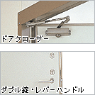 | 床からの底冷え防止などに断熱効果があります.また,結露防止や冷・暖房効率向上のために寒冷地のみならず一般地域にもお勧めします.施工後の取り付けは出来ませんのでご注意ください.(同時発注用オプション品) | 耐水合板(低ホルマリン-厚さ12mm)に木目柄のシートを貼り付けた丈夫な床材使用。オプション品の(A)カーペット (B)土間マット(枠付)などを用意しています. | 高水準の水密,気密性をほこるアルミ枠製の高級フラッシュドア.ピッキング対応のダブルロック錠(室内側にも2つの内錠),把手はレバーハンドル採用.さらに,本格的ドアクローザー標準装備で安全性と防犯性を追求しました. ※標準仕様は外観右開きです.左開きの場合はご指定ください. (詳しくはメールにてご相談ください) |
