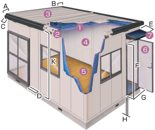 | 天井材は硬質発泡ポリウレタンフォーム(厚さ20mm)の表面を,クロス柄のシートで化粧した断熱効果の高い素材を新採用. 内壁は断熱効果の高い準不燃材料「認定番号QM-9817」の素材=ロックウール材(厚さ15mm)を使用,表面は新採用のクロス柄オレフィンシートで化粧してあります. ※多雪地や寒冷地等の地域はオプションの断熱材や市販品の断熱材との併用が必要となります.(詳しくはメールにてご相談ください) |