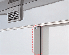 引き分け戸タイプには開閉時の消音などの目的のために鴨居部分にイナバ独自のラッチを採用. | 雨水浸入防止や換気効果などに配慮した独自設計の換気ガラリです. | 平らで丈夫な床板は,掃除や物の出し入れが簡単.しかも, 5880N/m2(600kgf/m2) の重量に耐える設計です. |