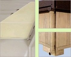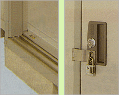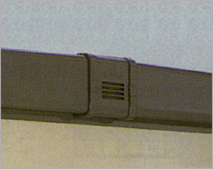 | 切妻屋根の特長を生かした重厚なデザイン.屋根回り,梁,桁,屋根パネルなどには高級な素材のガルファン材(溶融亜鉛−5%アルミニウム合金めっき鋼板)を採用しているため耐久性にも優れています.また,梁の中央部には換気ガラリが取り付けてあり,さらに機能性アップ. | 乙種防火戸対応型(板厚0.8o)の丈夫な扉(サイド扉方式).レールは滑りや耐久性に優れたアルミの押し出し材を採用しております.鍵がなくても仮ロックできるイナバ独自のカマ錠採用.学校など公共向けとして,南京錠やナンバー錠が使用できるよう掛金(オプション)が用意されております. | 屋根パネルの裏面には化粧シート付結露防止材(発泡ポリエチレン厚さ5mm)が貼り付けてあります. ○注 写真は結露防止材を一部省いてあります. 掃除がしやすい本格的な雨といが標準で付いております. ○注 たてといは角型50を採用. |