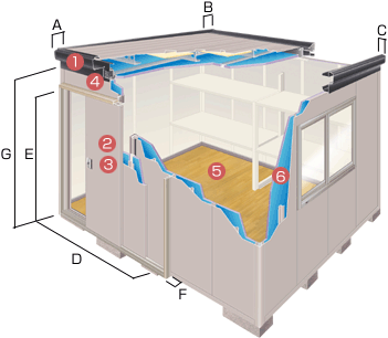 | 天井材は硬質発泡ポリウレタンフォーム(厚さ20o)の表面を,クロス柄のシートで化粧した断熱効果の高い素材を新採用. 内壁は断熱効果の高い準不燃材料「認定番号QM-9817」の素材=ロックウール材(厚さ15o)を使用,表面は新採用のクロス柄オレフィンシートで化粧してあります. ※多雪地や寒冷地等の地域では使用目的や用途によってオプションの断熱材や市販品の断熱材との併用が必要となります.(詳しくはメールにてご相談ください) |